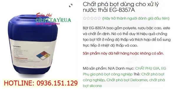 EG-B357A Chất Khử Bọt Trong Sản Xuất Công Nghiệp là chất khử bọt không chứa silicon, gồm polyete, rượu bậc cao, este và chất ổn định. Sản phẩm hoạt động hiệu quả ở liều lượng thấp, khử bọt nhanh, ức chế bọt lâu, an toàn cho vi sinh vật và không gây tác dụng phụ.